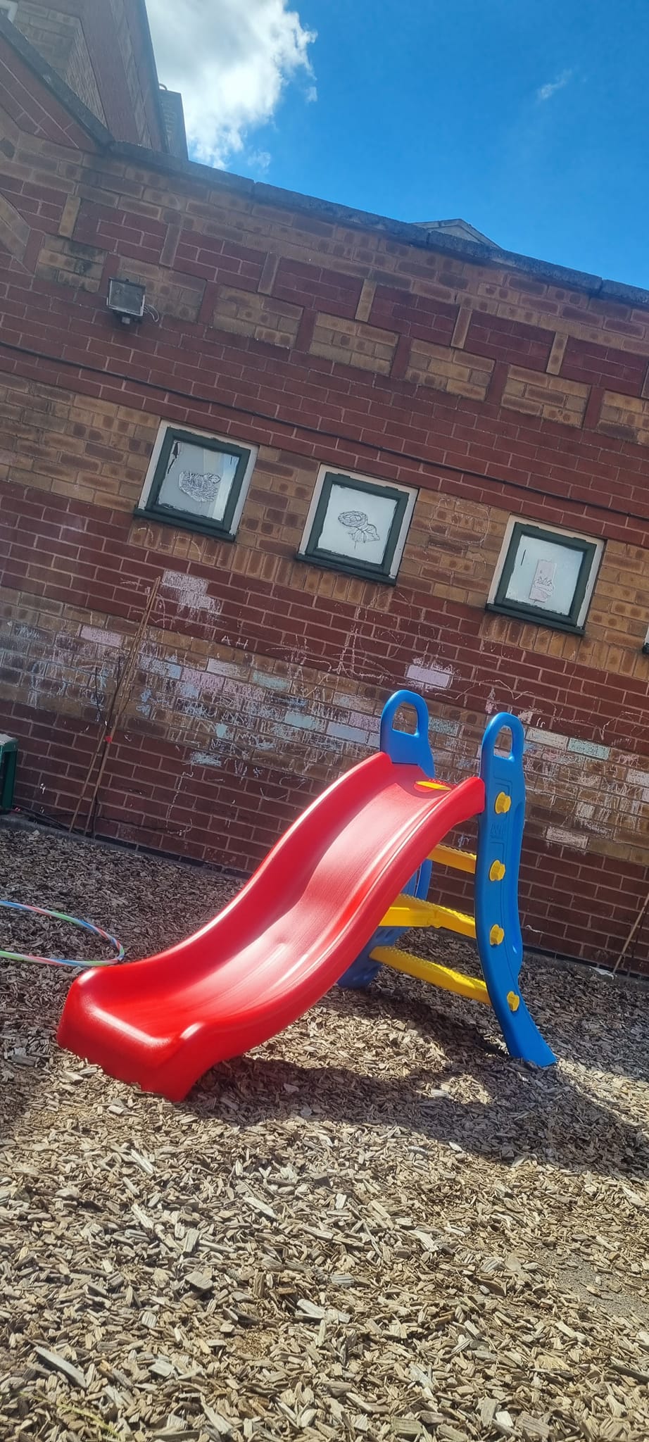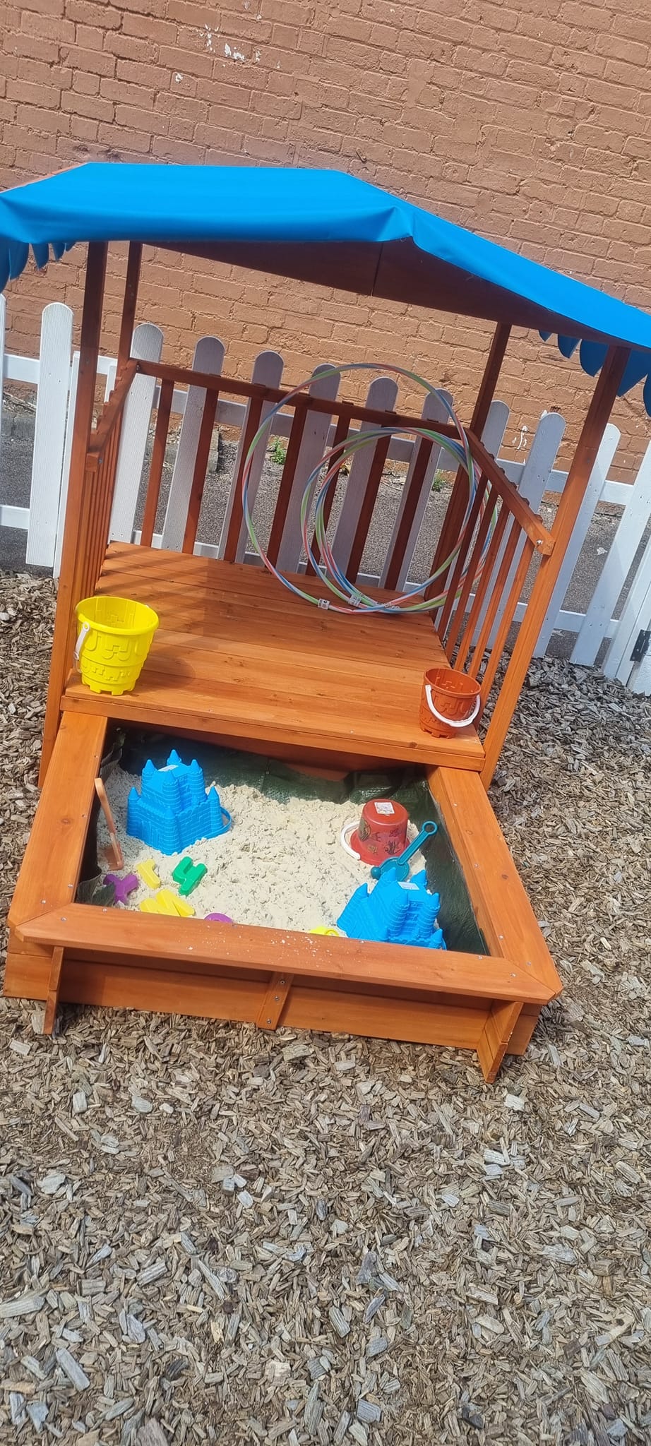 We have a beautiful, secure garden, with an all natural bark flooring. The garden has a summer house, slides, water wall and sheltered sand pit.